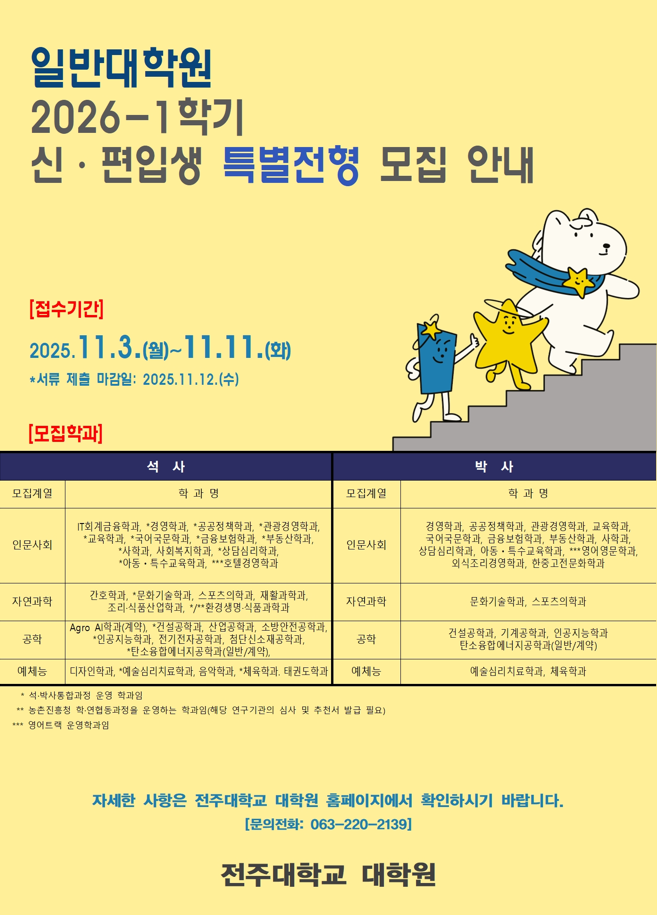 구분 | 전형일정 | 접수기간 | 2025. 11. 3.(월) 09:00~11. 11.(화) 18:00 | 서류제출 마감일 | 2025. 11. 12.(수) 17:00 | 전형일 | 2025. 11. 21.(금) | 합격자 발표 | 2025. 11. 27.(목) 15:00 이후 개별 안내 | ※ 문의전화 : 063) 220-2139 대학원 통합행정지원실 |