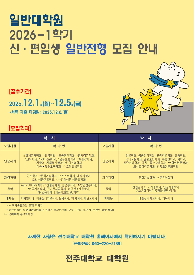 구분 | 전형일정 | 접수기간 | 2025. 12. 1.(월) 09:00~12. 05.(금) 18:00 | 서류제출 마감일 | 2025. 12. 8.(월) 17:00 | 전형일 | 2025. 12. 18.(목) | 합격자 발표 | 2025. 12. 29.(월) 15:00 이후 개별 안내 | ※ 문의전화 : 063) 220-2139 대학원 통합행정지원실 |
