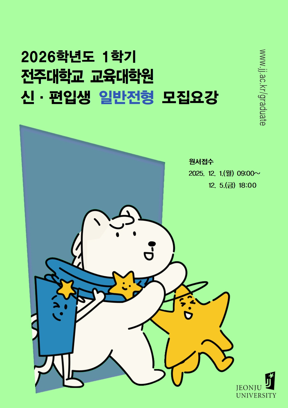 5. 원서접수 시 유의사항 가. 전형별 입학원서 접수 마감 시간 내 입학원서 작성 후 전형료 결제까지 완료하여야 유효한 원서접수로 인정합니다. 나. 제출된 서류는 일체 반환하지 않으며, 기재된 내용이 사실과 다르거나 본 요강의 지원 자격 요건에 해당하지 않는 자는 입학 후에라도 합격을 무효처리합니다. 다. 제출한 서류 중 미제출 서류 혹은 미비한 서류가 있을 시 입학 지원이 취소됩니다. 라. 지원서 입력 착오 또는 지원서의 연락처로 연락 시 미응답 등으로 인한 불이익에 대하여 본교에서는 책임지지 않습니다. ※ 자세한 내용은 모집요강을 참고하시기 바랍니다. 2025. 11. 14. 전주대학교 대학원장 |