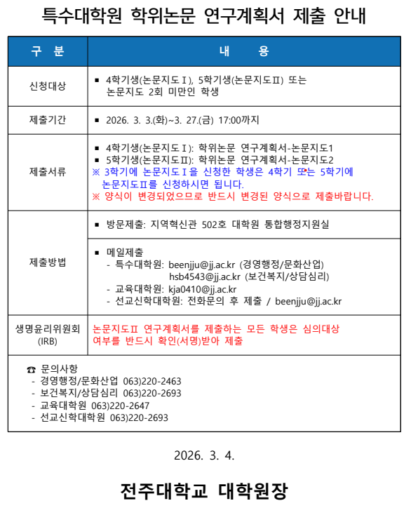 | [공통] [특수/교육] 특수대학원 학위논문 연구계획서 제출 안내(2026-1학기) |